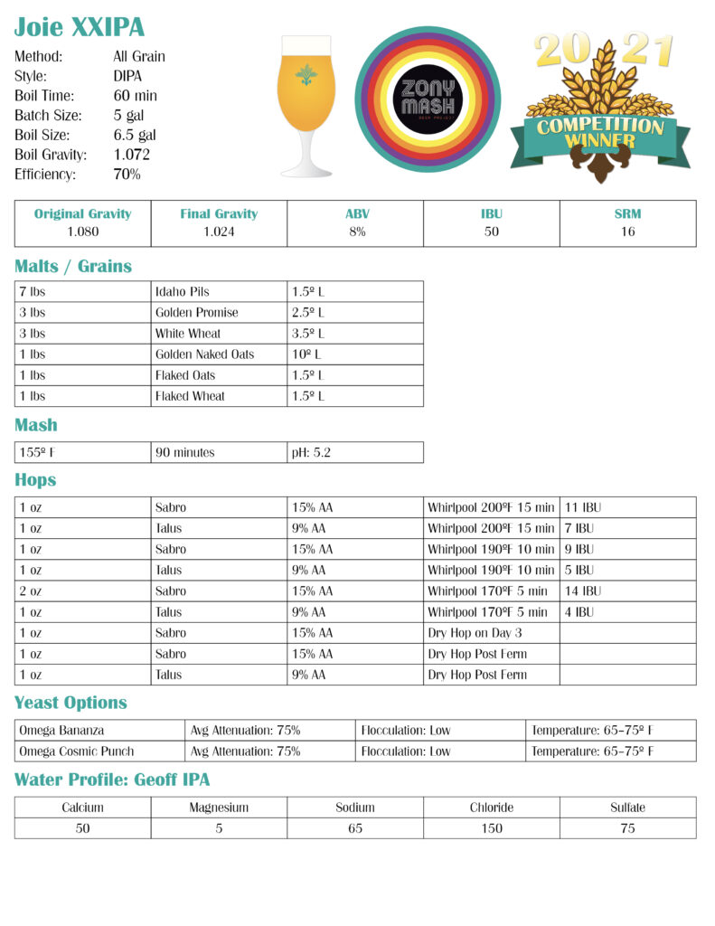 Joie is the dry hopped Double IPA juice of your dreams. This beer is incredibly soft and smooth on the palate with tons of peach, banana, and background notes of coconut and tangerine. With just a touch of clean bitterness on the backend to leave you with an even keel on all the juicy fruit, this beer will leave you coming back for more.