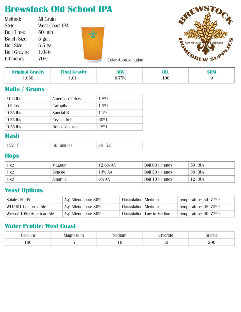 Looks to be from the days of Aaron, this recipe was once a Brewstock classic. A bold malt profile of Special B, Crystal 60, and Victory malts pair with a bold hop profile of Magnum, Simcoe, and Amarillo. This recipe is a no frills 100 IBU West Coast IPA.