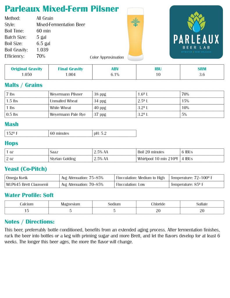 Thanks to Parleaux Beer Lab for participating in our Brew Like the Pros event! Eric thought it would be fun to co-pitch a Kveik and a Brett strain into one of their Pilsner grain bills. We recommend bottle conditioning this beer with Brett Claussenii for as long as you can to produce the most funky brett character as possible.