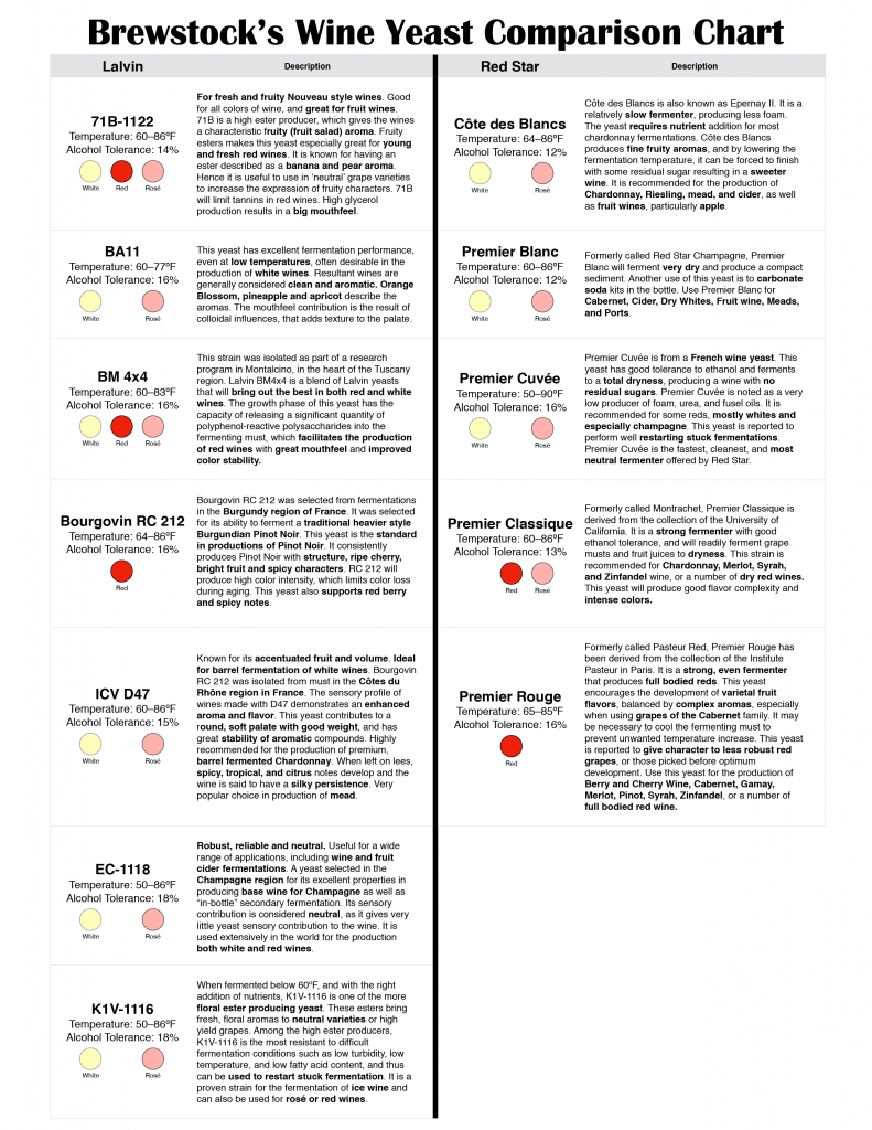 This handy chart shows the wine yeast we carry at Brewstock, and should help guide you in choosing the prefect yeast for your next project, whether it be wine, cider, mead, or something else.