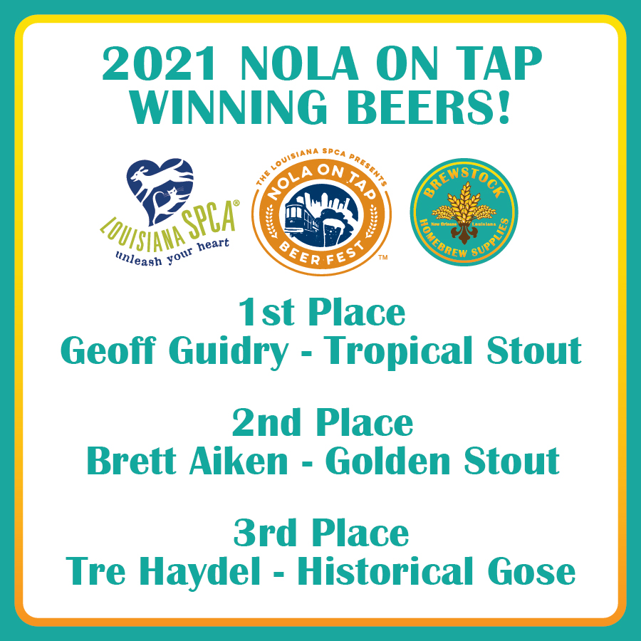 The Louisiana SPCA and Brewstock are proud to bring you the NOLA on Tap Homebrew Competition for 2021. Despite not having our favorite festival of the year, we are keeping NOLA on Tap alive this year with a remote competition, hosted through Brewstock Homebrew Supplies. Get pumped, get excited, start planning your beers.